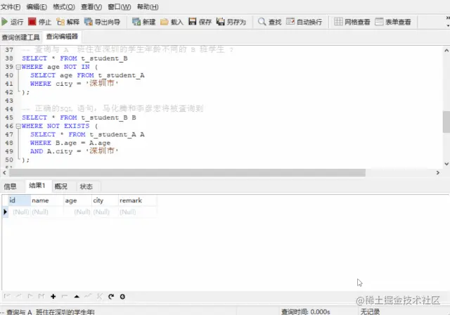 也就是说,yzb 被作为 “与任何人的年龄都不同的人” 来处理了。EXISTS 只会返回 true 或者false,永远不会返回 unknown。因此就有了 IN 和 EXISTS 可以互相替换使用,而 NOT IN和 NOT EXISTS 却不可以互相替换的混乱现象。