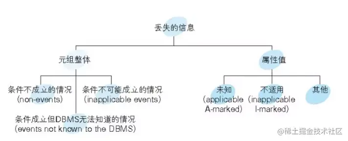 关系模型的发明者 E.F. Codd 最先给出了这种分类。下图是他对“丢失的信息”的分类