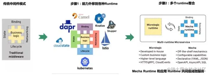 在ServiceMesh初步成功,Sidecar模式被云原生社区普遍接受之后,效仿ServiceMesh,将应用需要的其他分布式能力外移到各种Runtime变成为一个趋势。这些Runtime会逐渐整合,最后和应用 Runtime 共同组成微服务,形成所谓的“Multi-Runtime”架构,又称Mecha: