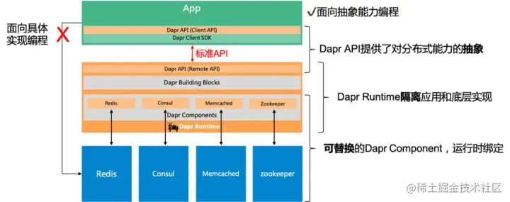 - Dapr API 提供了对分布式能力的抽象,并提取为标准API