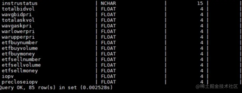 这类数据每日通过Python连接器的方式,在收盘后批量导入再做分析。其中每个表代表一个股票,共85列,以Float数据为主,共32311张。