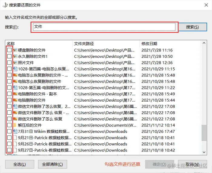 步骤三:输入文件名称对文件进行检索,勾选目标文件进行还原。
