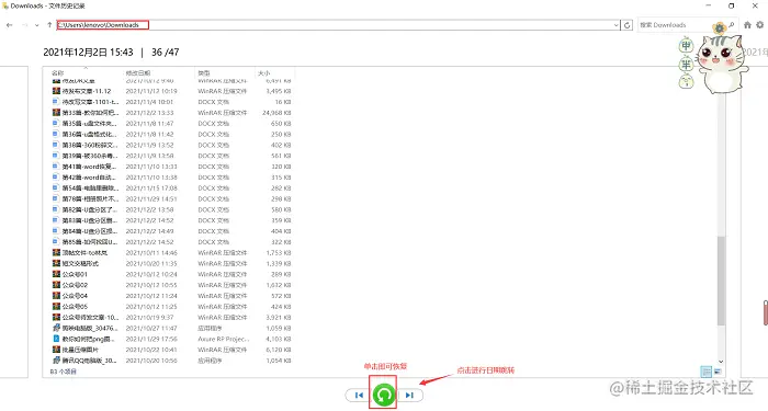 步骤二:根据相应的路径查看文件,点击相应的目标文件,单击下方的恢复按钮进行文件的还原。下方的箭头可以跳转到临近的日期。