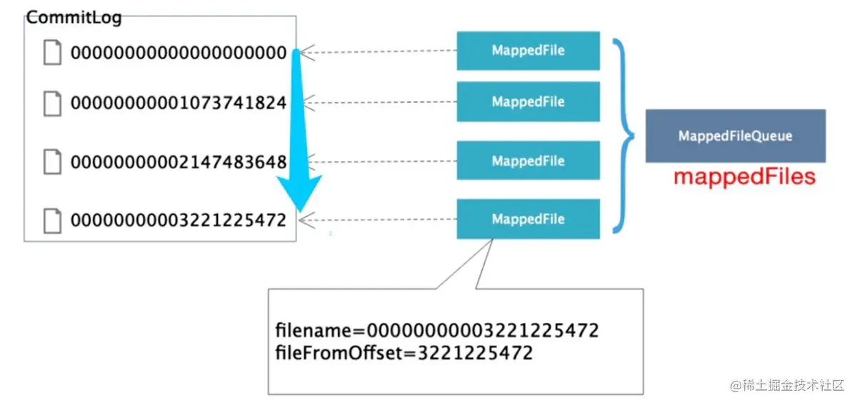 CommitLog 单个文件大小默认 1G, 文件名长度为 20 位,左边补零,剩余为起始偏移量,比如 00000000000000000000 代表了第一个文件,起始偏移量为 0,文件大小为 1G=1073741824;当第一个文件写满了,第二个文件为 00000000001073741824,起始偏移量为 1073741824,以此类推。消息主要是顺序写入日志文件,当文件满了,写入下一个文件。