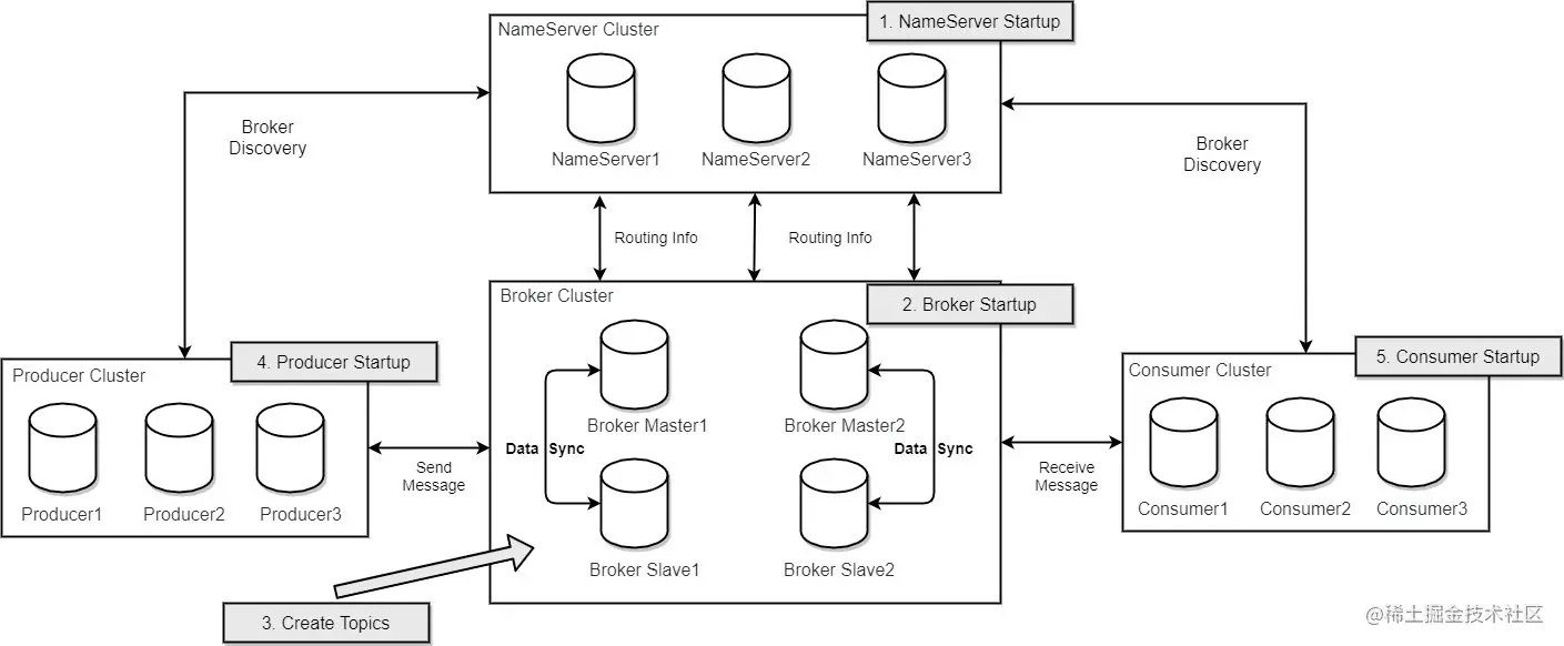 如果你自己动手部署过 RocketMQ, 相信对下面的这个部署架构图会非常清楚: