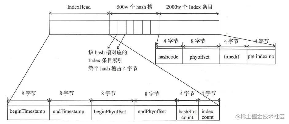 RocketMQ 的索引文件逻辑结构,类似 JDK 中 HashMap 的实现。索引文件的具体结构如下: