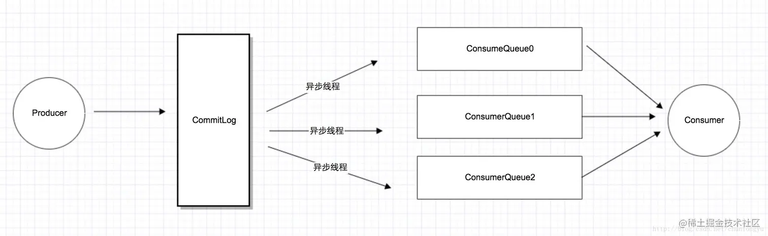 这其实是“异步化“,或者说”离线计算“的一个典型例子。这里之所以可以用“异步线程”,也是因为消息队列天生就是用来“缓冲消息”的。只要消息到了 CommitLog,发送的消息也就不会丢。只要消息不丢,那就有了“充足的回旋余地”,用一个后台线程慢慢同步到 ConsumeQueue,再由 Consumer 消费。 可以说,这也是在消息队列内部的一个典型的“最终一致性”的案例:Producer 发了消息,进了 CommitLog,此时 Consumer 并不可见。但没关系,只要消息不丢,消息最终肯定会进入 ConsumeQueue,让 Consumer 可见。