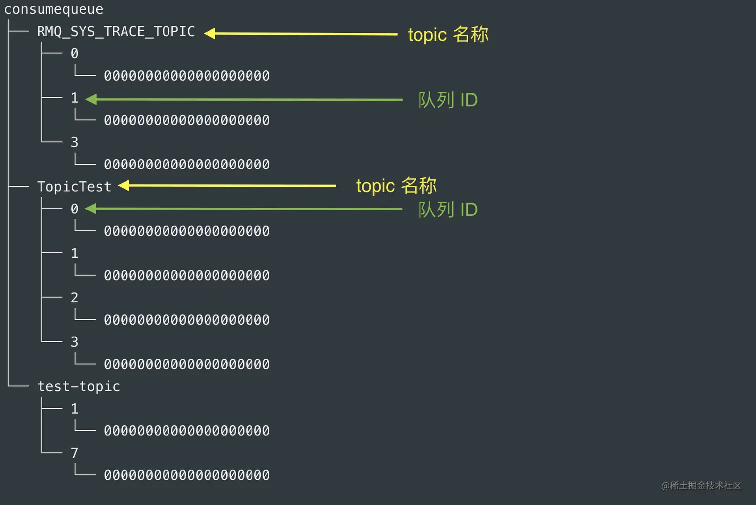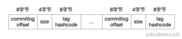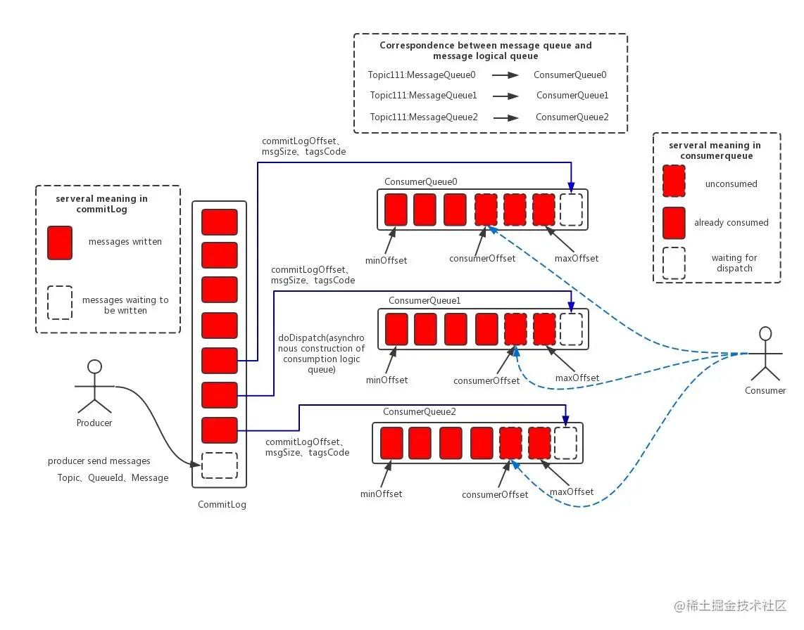 ConsumeQueue(逻辑消费队列)作为消费消息的索引,保存了指定 Topic 下的队列消息在 CommitLog 中的起始物理偏移量 offset,消息大小 size 和消息 Tag 的 HashCode 值。而 IndexFile(索引文件)则只是为了消息查询提供了一种通过 key 或时间区间来查询消息的方法。