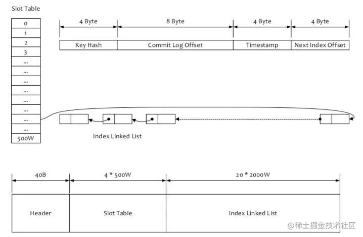 先是根据 key 计算 hashcode,对 500w 取模,就可以知道位于哪个 hash 槽。indexHead 占了文件的前面的 40 字节。然后每个 hash 槽占 4 个字节。具体在文件的位置是由公式 40 + keyIndex*4 计算得到的。