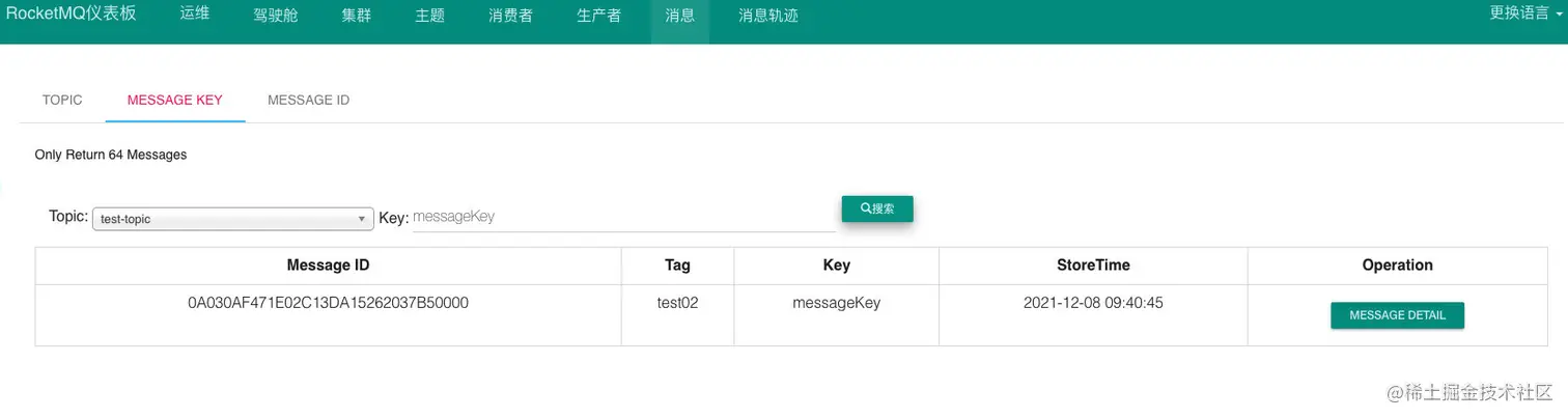 “按照 Message Key 查询消息”的方式,RocketMQ 的具体做法是,主要通过 Broker 端的 QueryMessageProcessor 业务处理器来查询,读取消息的过程就是用 topic 和 key 找到 IndexFile 索引文件中的一条记录,根据其中的 commitLog offset 从 CommitLog 文件中读取消息的实体内容。