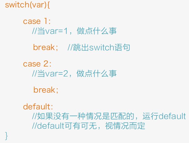 2、关键字break用于退出switch语句,通常每条case语句都以break结尾。如果没有break语句,switch语句将会一直执行接下来的语句(一直向下)直到遇见一个break,或者switch语句结尾。