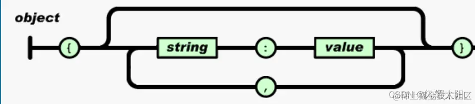 对象(object)是一个无序的“名称/值 对”集合,一个对象一“{”(左括号)开始,“}”(右括号)结束。每个“名称”后跟一个“:”(冒号);“‘名称/值’ 对”之间使用“,”(逗号)分隔。