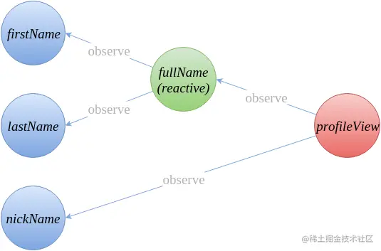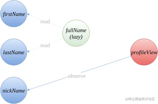 初始状态下,nickName是undefined, Update直接依赖nickName和fullName, 间接依赖项是firstName和lastName, 依赖关系可以参考下图: