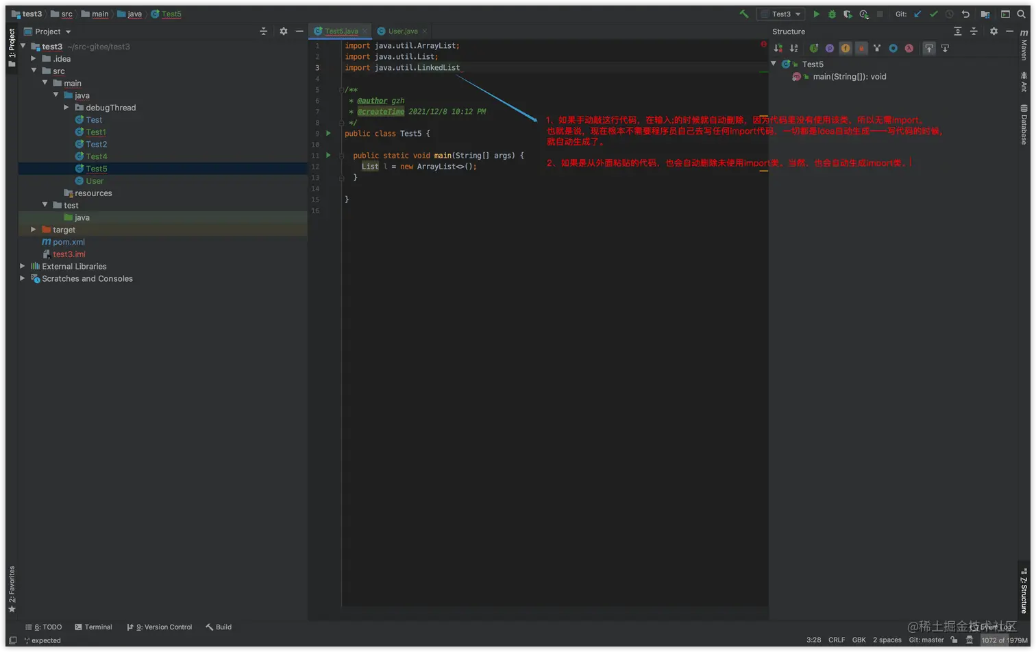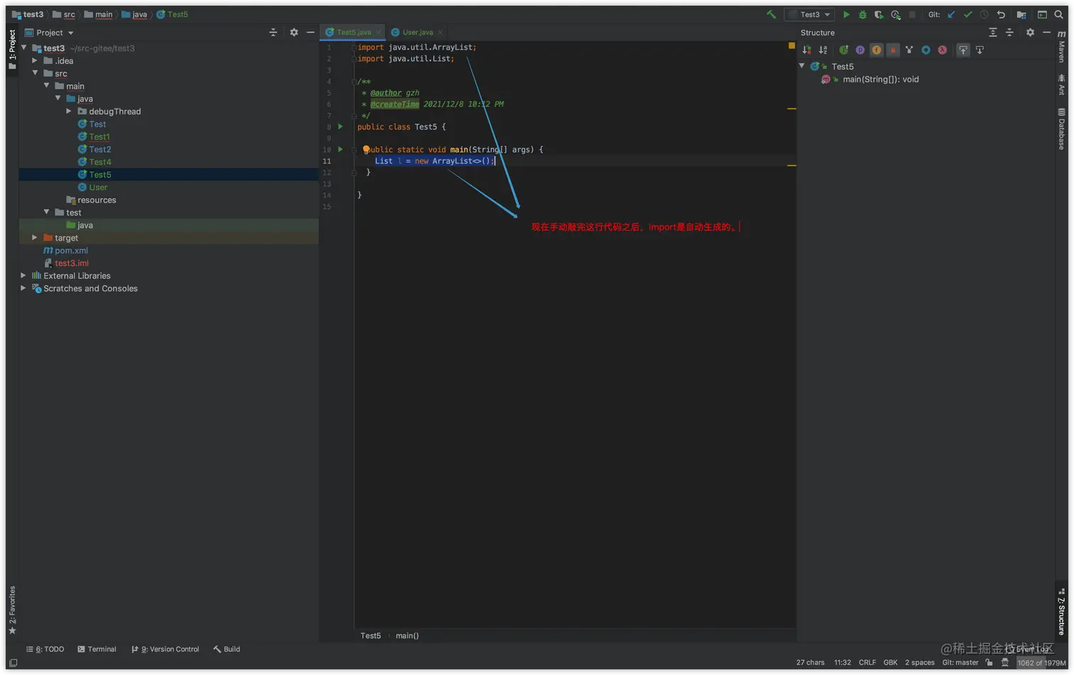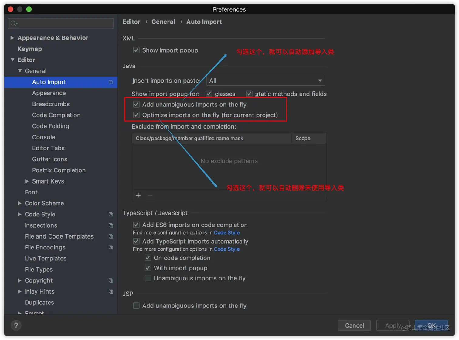 idea如何自动生成import类代码? Java个体户 2021-12-08 374 阅读1分钟 为何要开启该功能? 因为 手动敲代码,还需要手动import,麻烦。 无用的import,还需要手动删除,麻烦。 复制粘贴的代码,可能需要手动import很多类,或者要手动删除未使用import,麻烦。 所以,开启该功能,大大提高开发效率。 如何自动import类? 看截图说明,按截图说明勾选即可。 演示效果 自动import类 自动删除未使用import 参考 blog.csdn.net/weixin_3753… 完整官方文档 www.jetbrains.com/help/idea/c…
