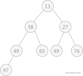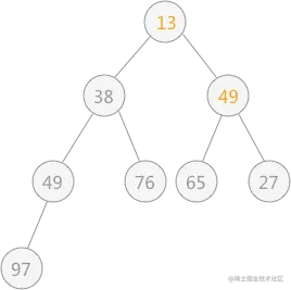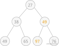 以无序表{49,38,65,97,76,13,27,49}来讲,其对应的堆用完全二叉树来表示为:
