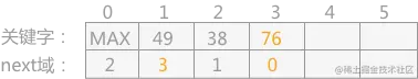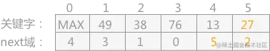 int next;//指针项,由于在数组中,所以只需要记录下一个结点所在数组位置的下标即可。