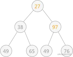 此时由于结点 97 比左右孩子结点的值都大,破坏了堆的结构,所以需要进行调整:首先以 堆顶元素 97 同左右子树比较,同值最小的结点交换位置,即 27 和 97 交换位置: