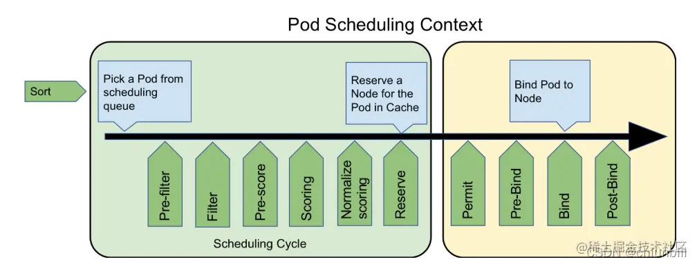 Framework的调度流程是分为两个阶段scheduling cycle和binding cycle. scheduling cycle是同步执行的,同一个时间只有一个scheduling cycle,是线程安全的。binding cycle是异步执行的,同一个时间中可能会有多个binding cycle在运行,是线程不安全的。