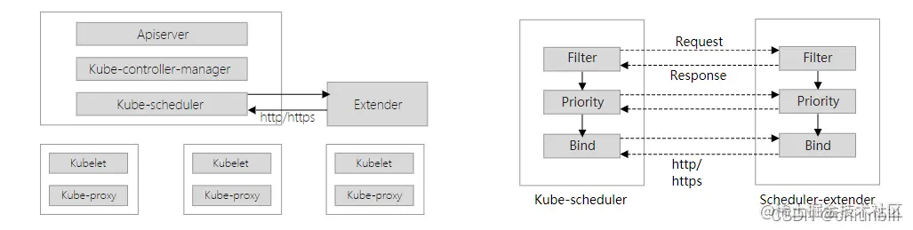 社区最初提供的方案是通过Extender的形式来扩展scheduler。Extender是外部服务,支持Filter、Preempt、Prioritize和Bind的扩展,scheduler运行到相应阶段时,通过调用Extender注册的webhook来运行扩展的逻辑,影响调度流程中各阶段的决策结果。