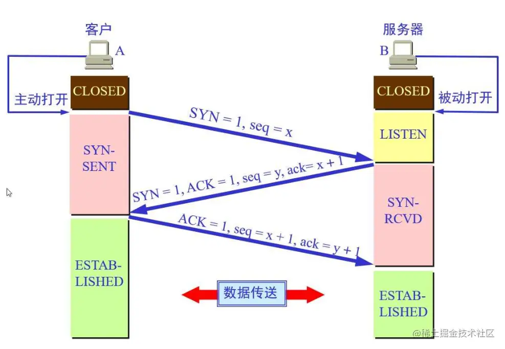 - sqe=x(A随机选择初始的序号 x) 然后客户端处于SYN-SENT状态