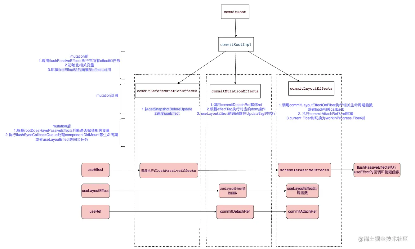 commit阶段发生在commitRoot函数中,该函数主要遍历effectList,分别用三个函数来处理effectList上的节点,这三个函数是commitBeforeMutationEffects、commitMutationEffects、commitLayoutEffects,他们主要做的事情如下,后面会详细讲解,现在在大脑里有一个结构就行