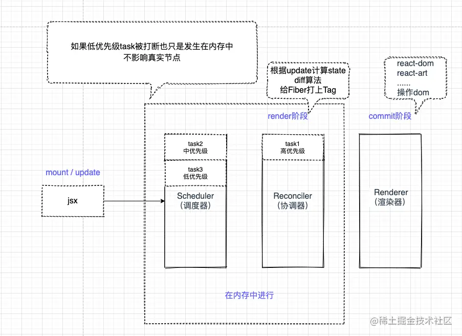 Reconciler发生在render阶段,render阶段会分别为节点执行beginWork和completeWork(后面会讲),或者计算state,对比节点的差异,为节点赋值相应的effectTag(对应dom节点的增删改)