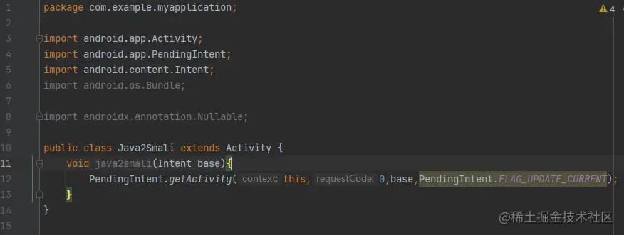 即使在test()方法中,已经创建好了Intent对象,而且也是显式调用,但在java2smali方法中,仅能看到一个.param p1, "base" # Landroid/content/Intent;被传入PendingIntent的构造方法里,并不能确定是否是显式调用。