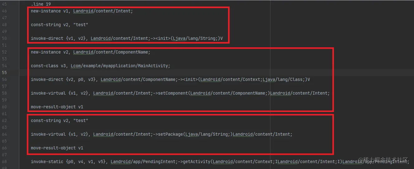 .line 19,也是一个显式Intent的示例,创建了一个Intent对象,然后参数v2 为const-string v2, "test"。然后调用了setComponent,创建ComponentName对象,传入p0,和const-class v3, Lcom/example/myapplication/MainActivity;。最后调用了move-result-object v1,将上条计算结果的对象指针移入v1寄存器,也就是Intent。同理最后的setPackage也是类似的。