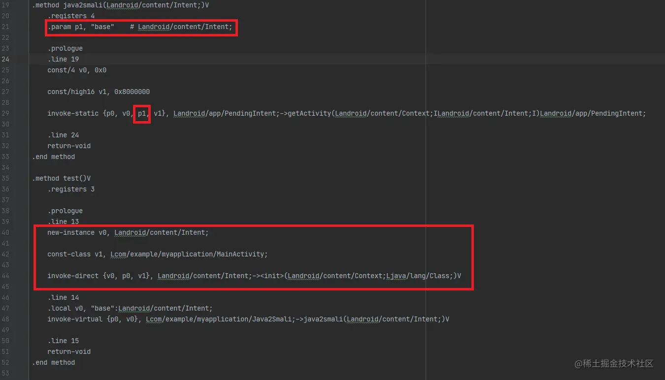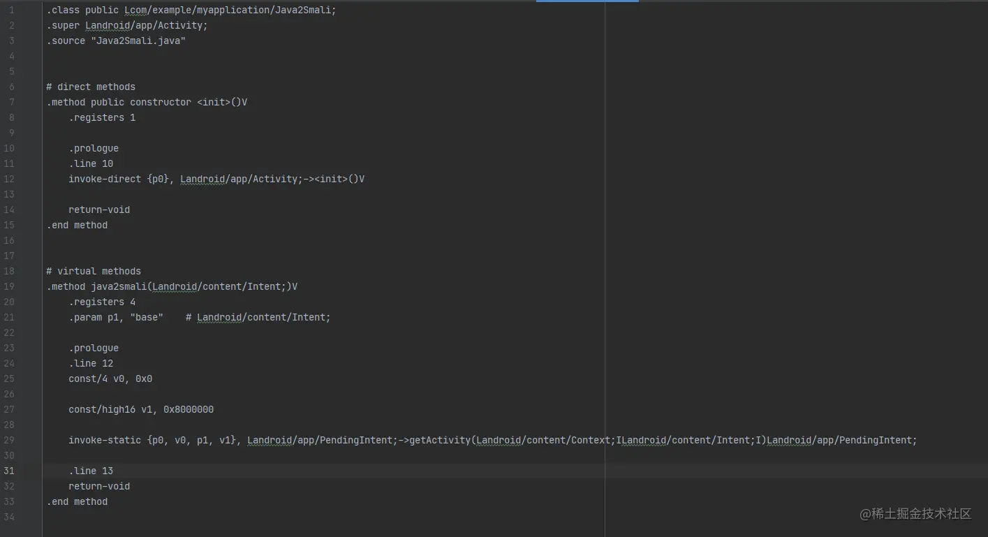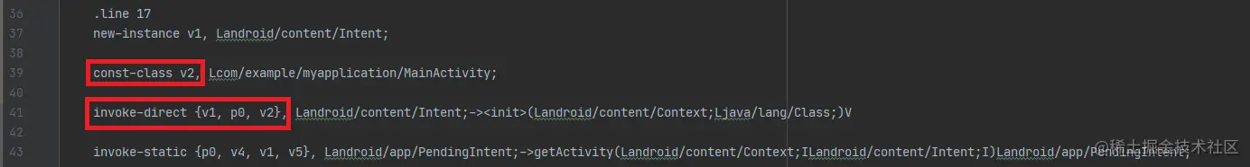 .line 17是一个显式的Intent的示例,可以比较清楚的看出,invoke-direct调用了Intent的构造方法,然后传入p0(this),和const-class v2, Lcom/example/myapplication/MainActivity;