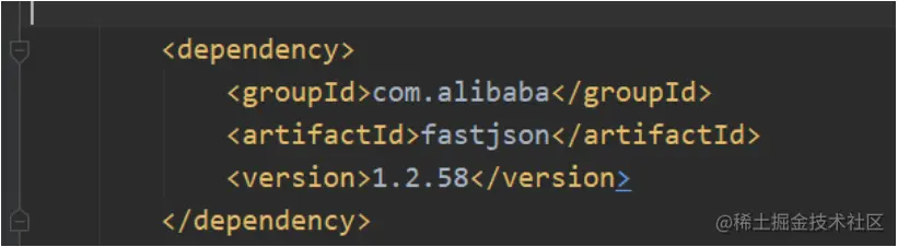 所以就翻翻其他文件,首先要看的就是pom.xml看下有哪些依赖包,提交的数据都是json的,其实也猜到一些,这里可以看到fastjson1.2.58,一个存在漏洞的版本,而目标如果一样的话,那就可以先获取高危一枚。