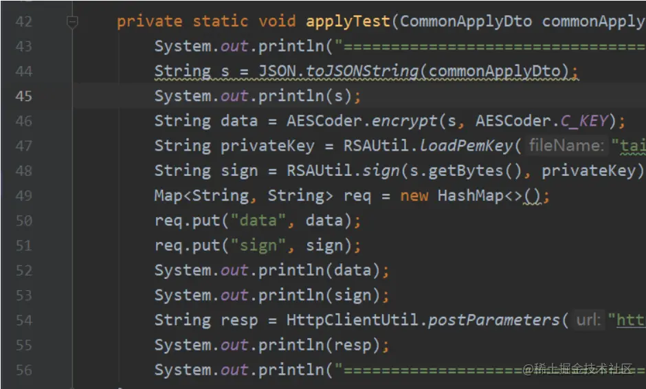 回头再看看其他源码,有个XXXCashTest.java,是用于客户端提交数据测试的,随便找到一个方法,commonApplyDto是接口参数的类,通过fastjson序列化成字符串,将字符串使用AES加密,作为data的参数值,使用RSA私钥签名作为sign的参数值,然后再提交。他这里是loadPemKey读取本地私钥文件。