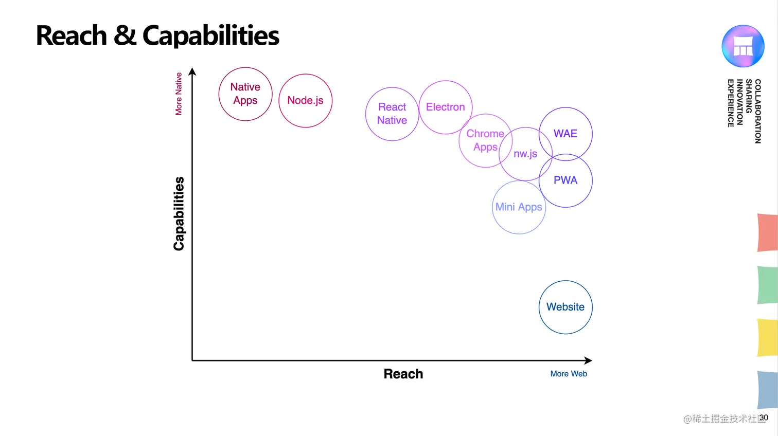 站在用户的角度,考虑能力及可达性两个维度,我们可以将一些常见的 Web 生态以如下的图表示: