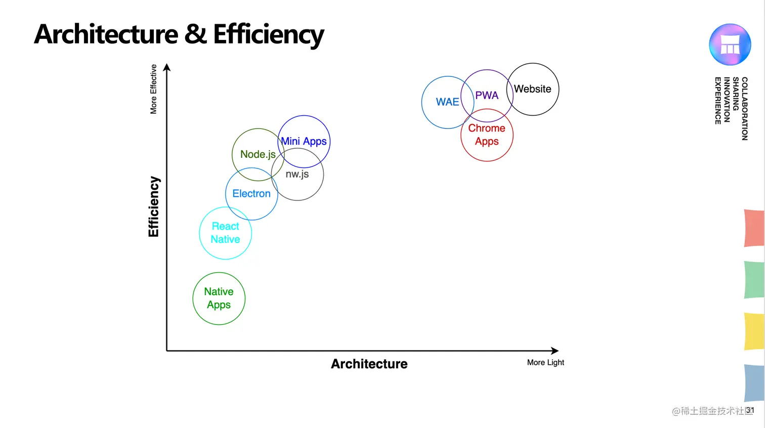 越往上,生态的研发效率越高;越往右,生态的架构复杂度越低。我们预期一个好的生态对于开发者来说尽量落在靠近右上方的位置。(如下图)