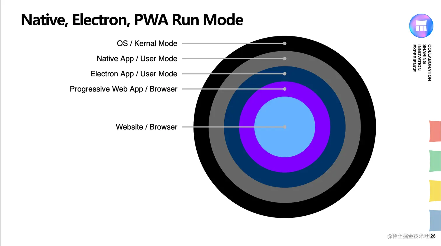 PWA 与这种方案看起来有相似之处,实则有着天壤之别。从代码的位置上看,Electron 多是本地的、离线的,PWA 则是在线的。Electron 所构建的应用程序存活于用户模式,由应用程序自身完全掌控自己命运。PWA 存活于浏览器中,一般情况下,浏览器为 PWA 提供所需要的所有能力以及安全保障,所以它不直接与 Win32 API、Cocoa API 或本机桌面开发人员使用的任何其他技术进行交互。