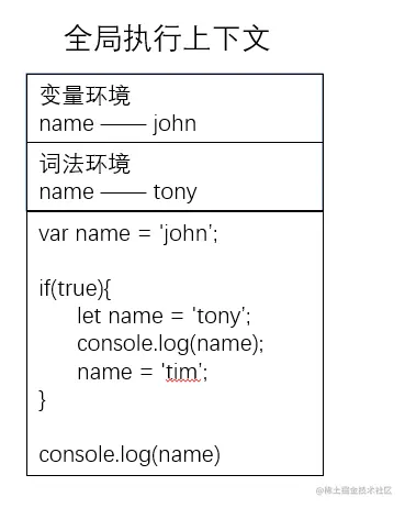 这样代码在访问变量时,如果处于块作用域中,会先访问对应的词法环境,如果找到不到,再访问变量环境。