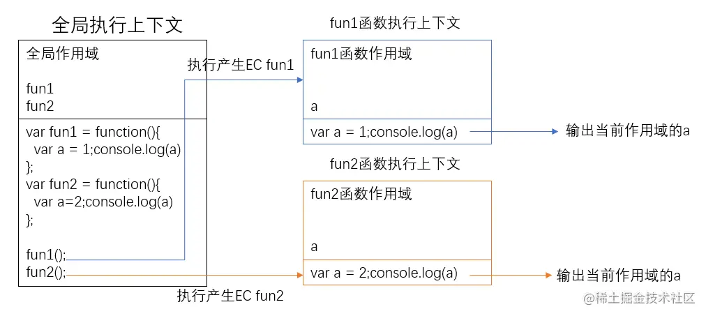 在上述例子中fun1和fun2中的a是在他们各自的作用域下的,因此输出的内容不同。