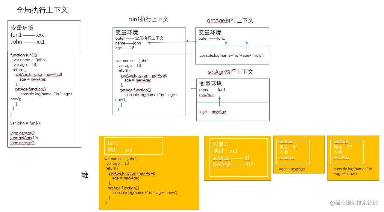 - 此后对象O的2个方法可以顺着作用域链访问name和age。