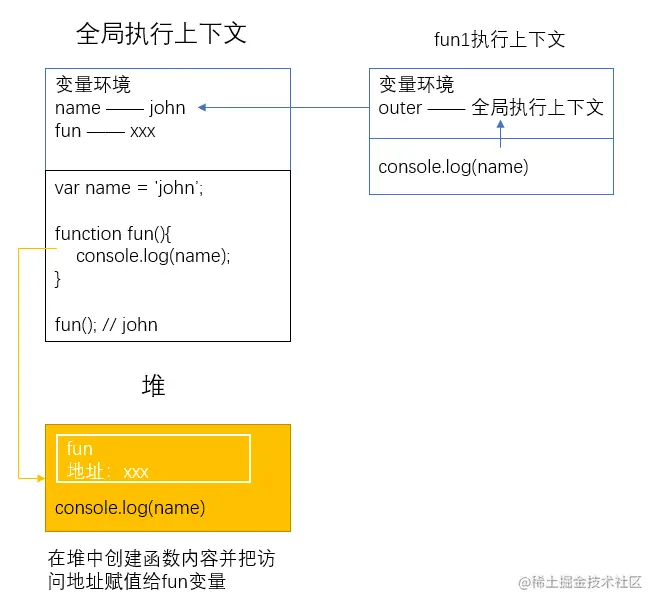 原来EC在创建的时候是会记录自己的上层EC的——outer,在访问变量的时候,会顺着outer往外找。大致如下图: