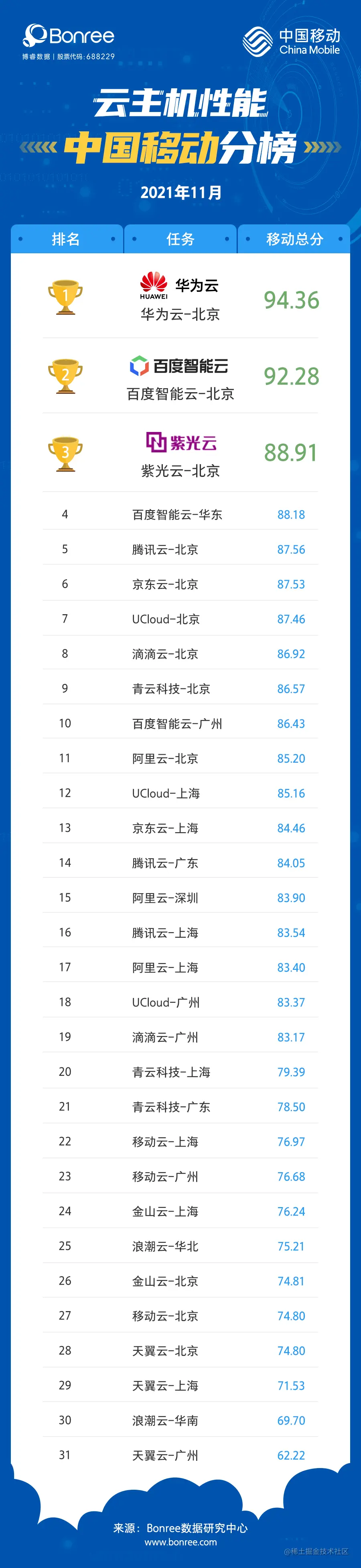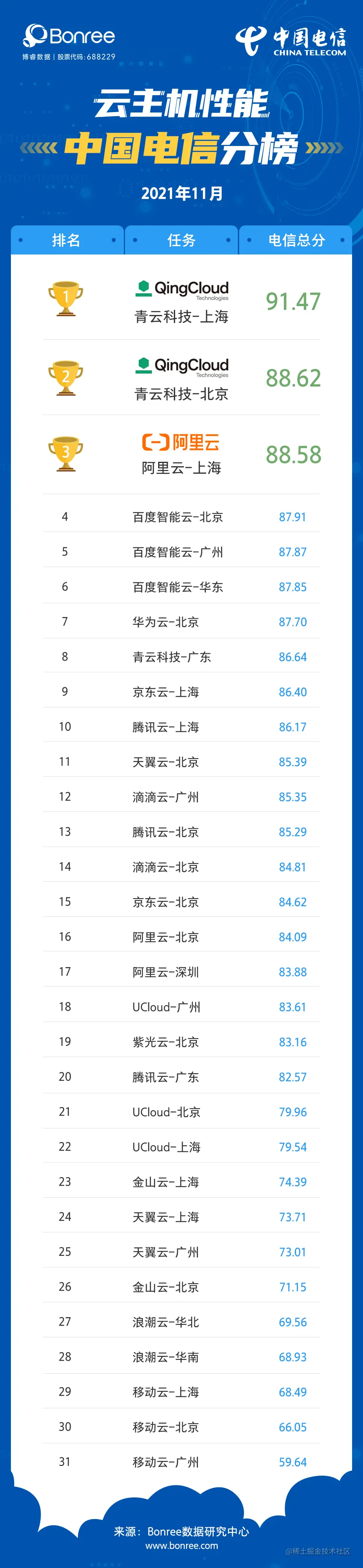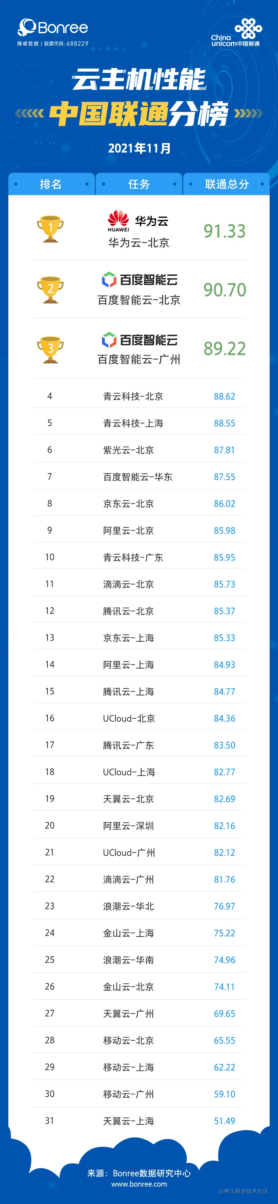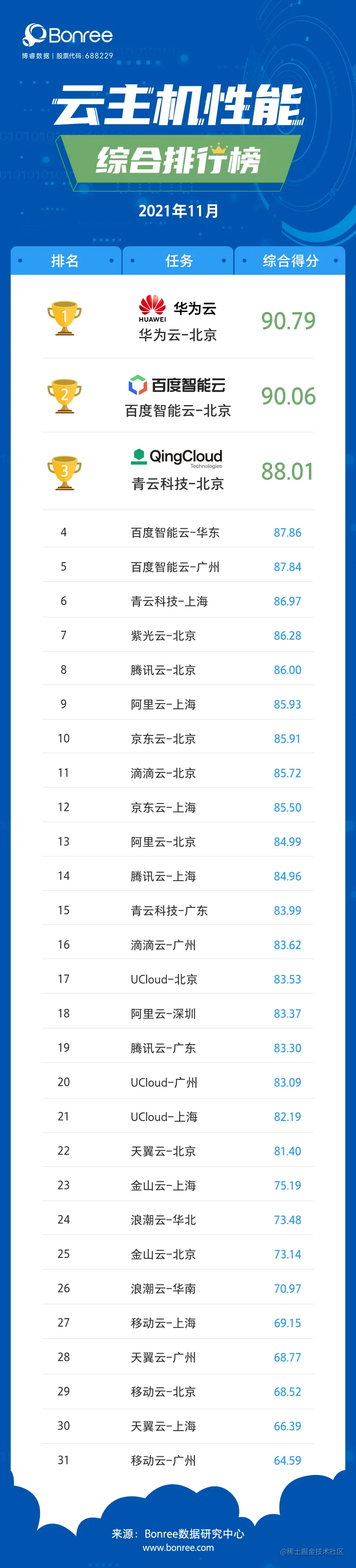 在2021年11月主机性能综合排行榜新鲜出炉,华为云-北京继续霸榜,百度智能云-北京和青云科技-北京位列第二、三名。