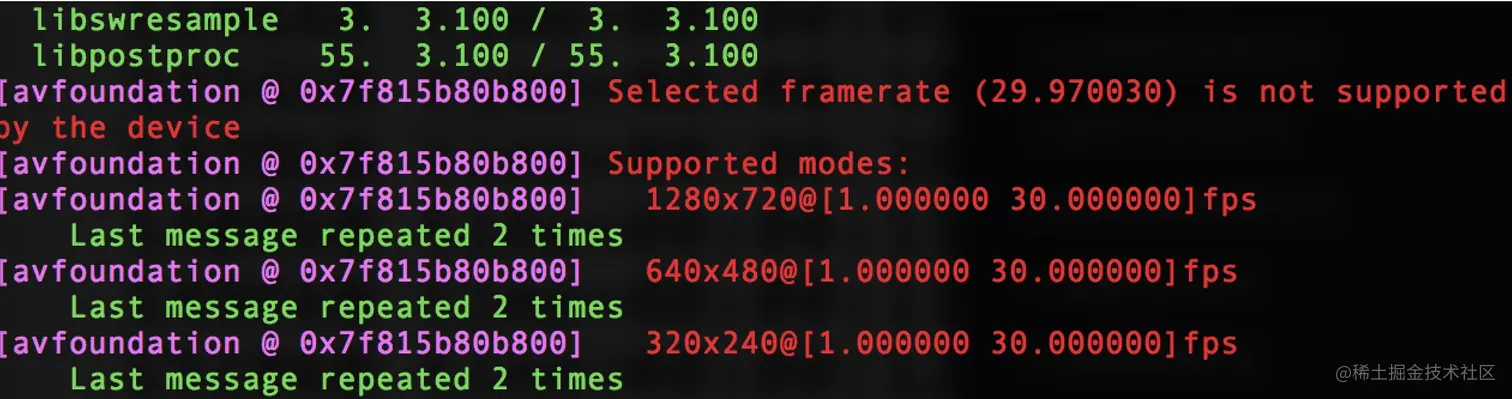 通过报错日志 Selected framerate (29.970030) is not supported by the device 可以看出,默认的framerate 不被设备支持,下面也给出了支持的分辨率和framerate,所以我们需要改一下命令: