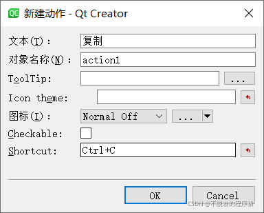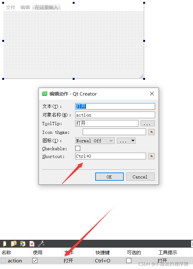 在Qt Designer的属性编辑器中可以对动作进行编辑,设置快捷键、图标等信息,其详细信息如下图所示: