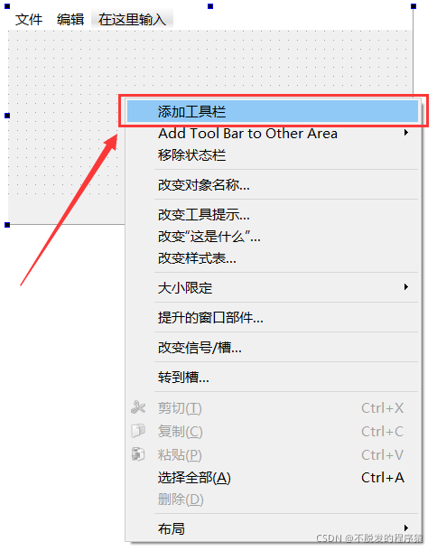 使用Qt Designer默认生成的主窗口中不显示工具栏,可以通过单击鼠标右键来添加工具栏,如下图所示: