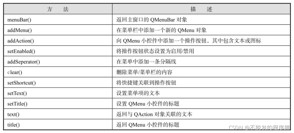 PyQt API提供了createPopupMenu()函数创建一个弹出菜单;menuBar()函数用于返回主窗口的QMenuBar对象; addMenu()函数可以将菜单添加到菜单栏中;通过addAction()函数可以在菜单中进行添加操作等。在设计菜单系统时使用的一些重要方法如下表所示: