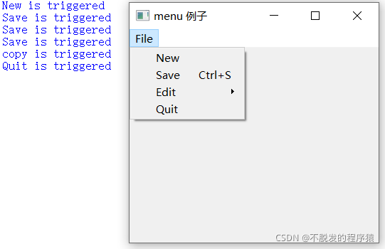 通个示例了解QMenuBar、QMenu和QAction菜单栏类,示例效果如下所示: