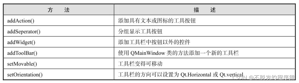 QToolBar类中的常用方法如下表所示: