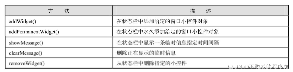 QStatusBar类中的常用方法如下表所示: