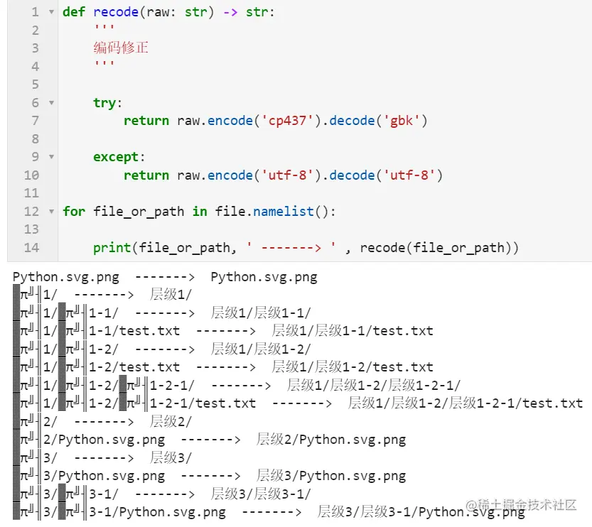 这是因为zipfile中针对压缩包内容的编码兼容性差,但我们可以通过下面的函数自行矫正: