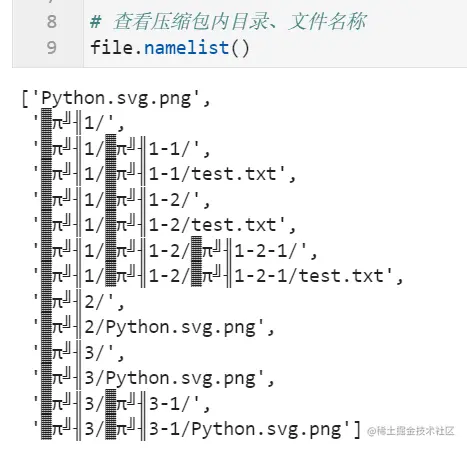 使用zipfile的extract()或extractall()方法直接解压时,产生的解压结果名充斥着乱码,这一点我们通过调用namelist()方法就可以看出来: