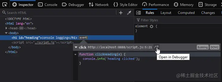 Firefox DevTools Inspector面板会在任何附加了处理程序的 DOM 元素旁边显示一个事件图标。单击图标查看函数名称,然后单击左侧的箭头图标展开代码。或者,在调试器中打开图标在调试器窗格中定位处理程序,以便您可以设置断点: