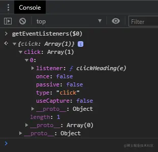 Chrome 的实现不是那么好,但是您可以通过将 DOM 节点传递给getEventListeners()函数来查看所有事件侦听器。例如,getEventListeners( $0 )显示应用于当前在Elements面板中突出显示的 DOM 节点的侦听器: